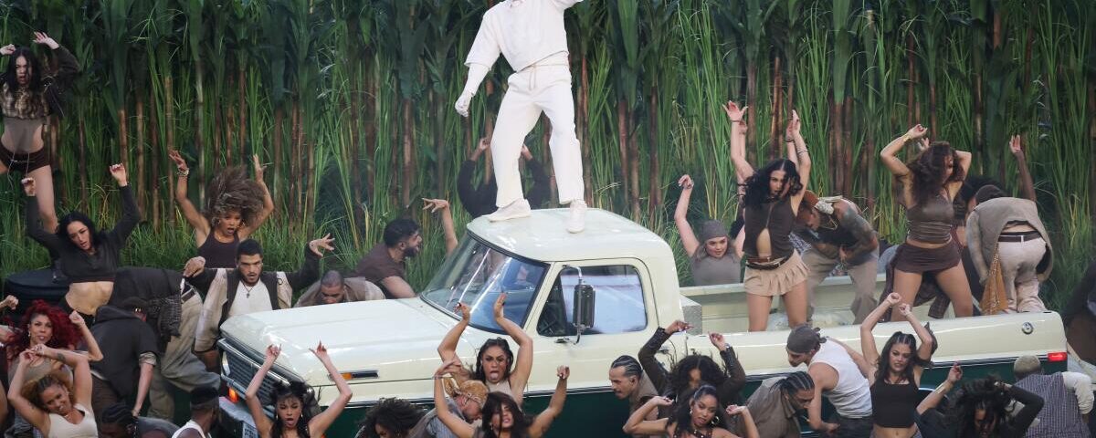 Τι έγινε όμως στο σόου; Η σκηνή άνοιξε με ζαχαροκάλαμα. Πράσινα χωράφια, εργάτες, σώματα που δουλεύουν. Ένα τοπίο που θυμίζει ότι η ευημερία κάποιων στην Αμερική χτίστηκε πάνω στη δουλειά άλλων. Ακολούθησαν οι αφηγηματικές σκηνές, μία La Casita, τα bodegas που θυμίζουν Νέα Υόρκη και διασπορά, piragua, γειτονιές, κόσμος που περνά, χορεύει, μιλά, γελά. Ήταν τόσο ζωντανό όλο αυτό, που ξεχνούσες ότι ήταν σκηνικά-μακέτες και τα ένιωθες κομμάτια της δικής σου ζωής. Πριν από δέκα χρόνια, η δουλειά του Μπενίτο Αντόνιο Μαρτίνες Οκάσιο ήταν να βάζει ψώνια σε σακούλες του σούπερ μάρκετ στο Πουέρτο Ρίκο και χθες το βράδυ έκανε το Super Bowl «ώπα», τραγουδώντας στα ισπανικά.